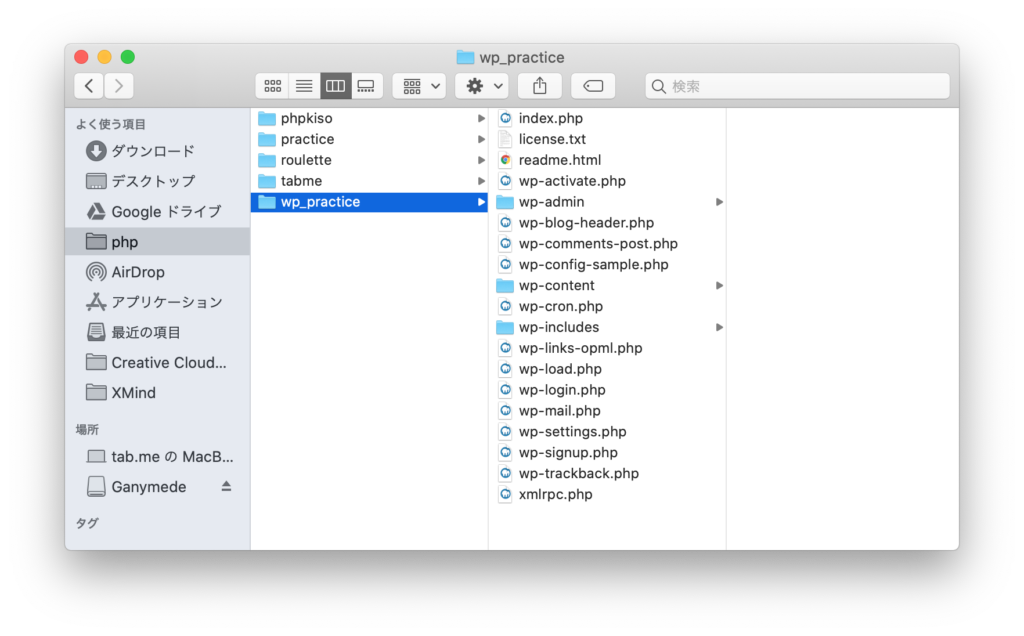 私は、今回「wp_practice」というフォルダをつくり、その中にDLしたWordPressを入れています
