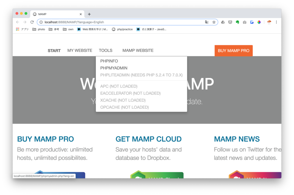 MAMPを立ち上げると勝手に開いてくれるwebページの「TOOLS」から「PHPMYADMIN」へ