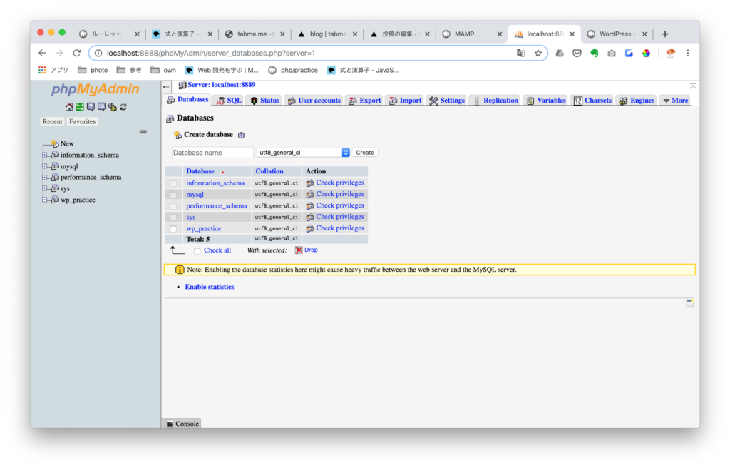 PHP MY ADMINのサイドバーの「New」から新しいデータベースを作成します